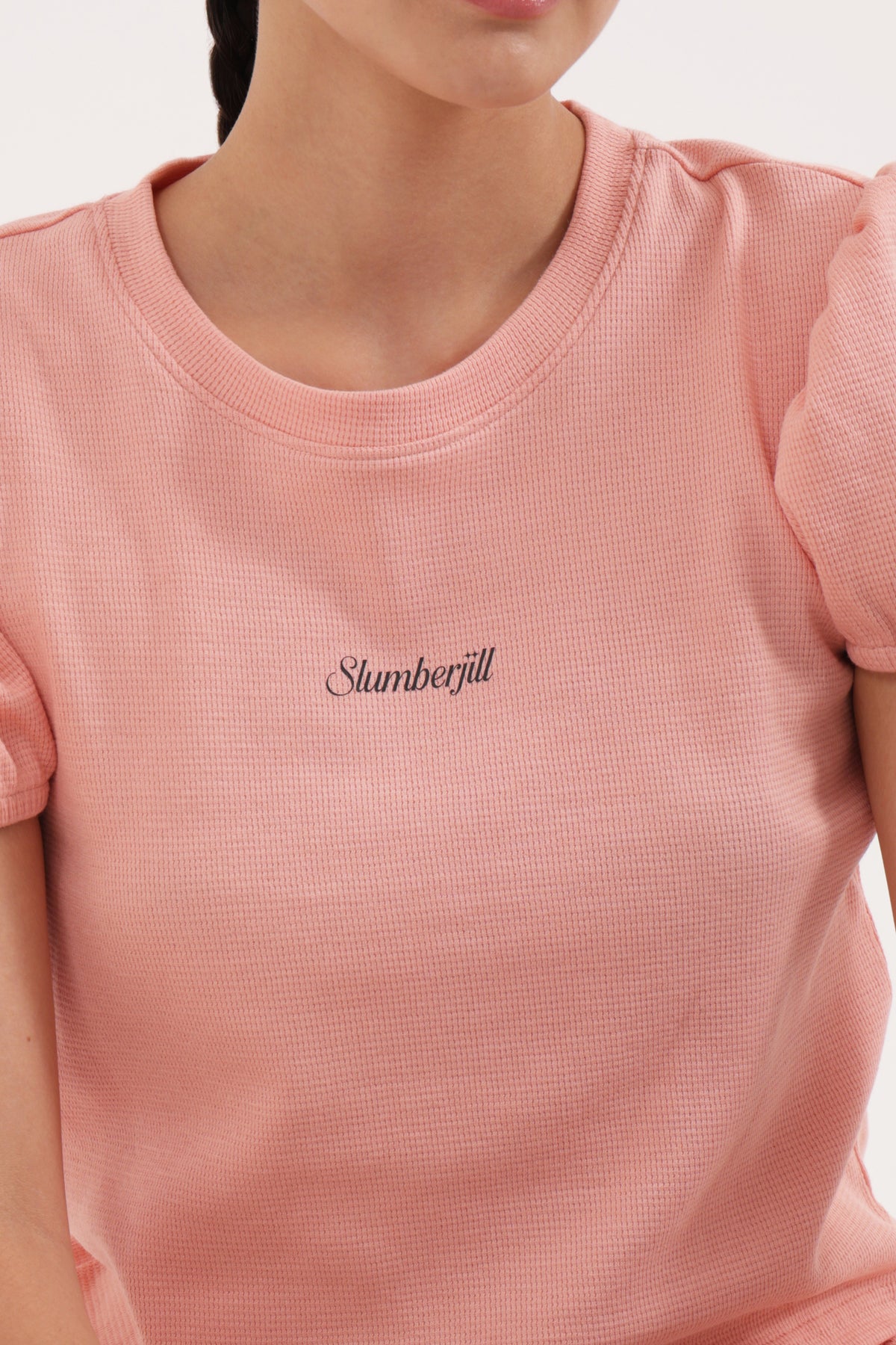 Stay cozy and effortlessly cute in this two-piece loungewear set crafted from soft cotton waffle knit fabric. The relaxed-fit top features balloon-style puffy sleeves and a subtle Slumberjill rubber print on the chest, adding a touch of charm. Paired with easy-fit shorts that include an elasticated waistband, practical side pockets, and a matching print on the pocket, this set is perfect for laid-back days, lounging at home, or running casual errands in style and comfort.