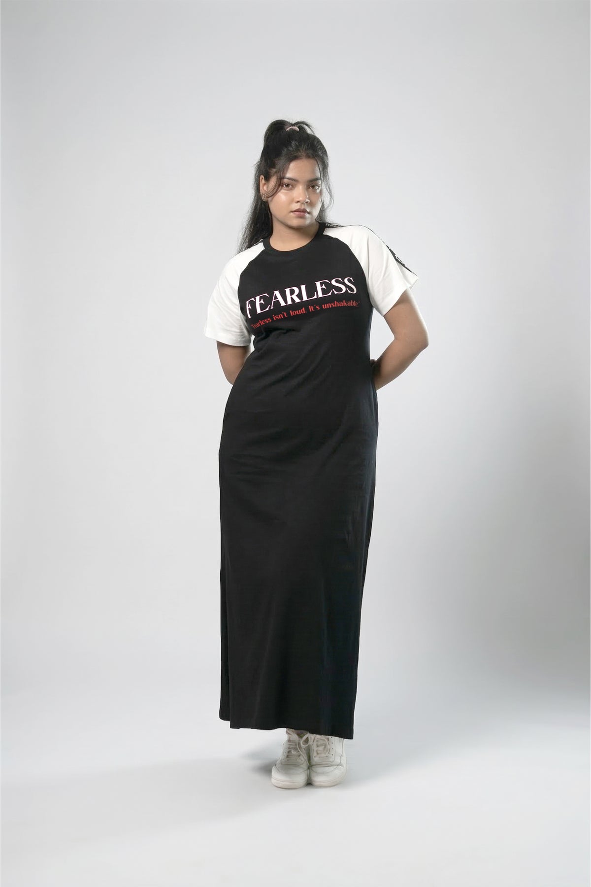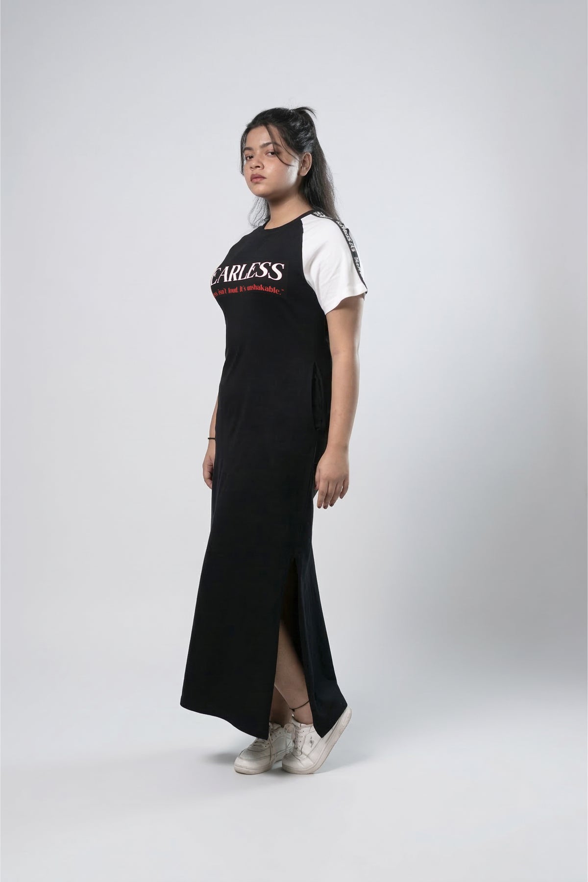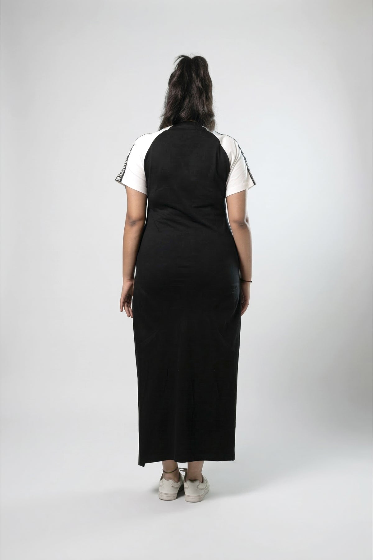 A bold, statement-making maxi dress crafted in soft, breathable 100% cotton jersey for effortless comfort and attitude. Designed with a relaxed silhouette, it features contrast raglan sleeves and a striking graphic detail on the front. The straight, elongated fit is enhanced with side slits on both sides, offering ease of movement and a subtle touch of allure. Perfect for off-duty days, this piece blends laid-back comfort with a confident, street-style edge.