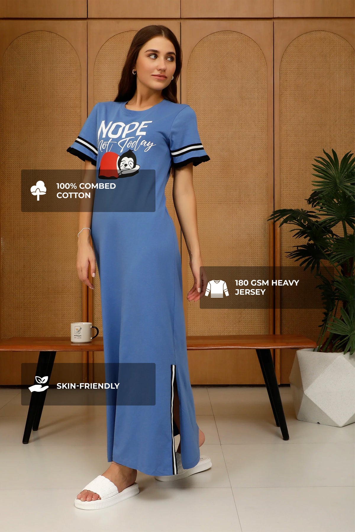 Designed for both comfort and style, the dress features a side slit on the leg, offering a glimpse of flair and ease of movement. Whether you're winding down for the night or simply lounging in style, this night dress ensures a perfect blend of relaxation and fashion-forward sophistication. Slip into this sporty yet comfortable attire, where each detail is meticulously crafted for a stylish and cozy bedtime experience..