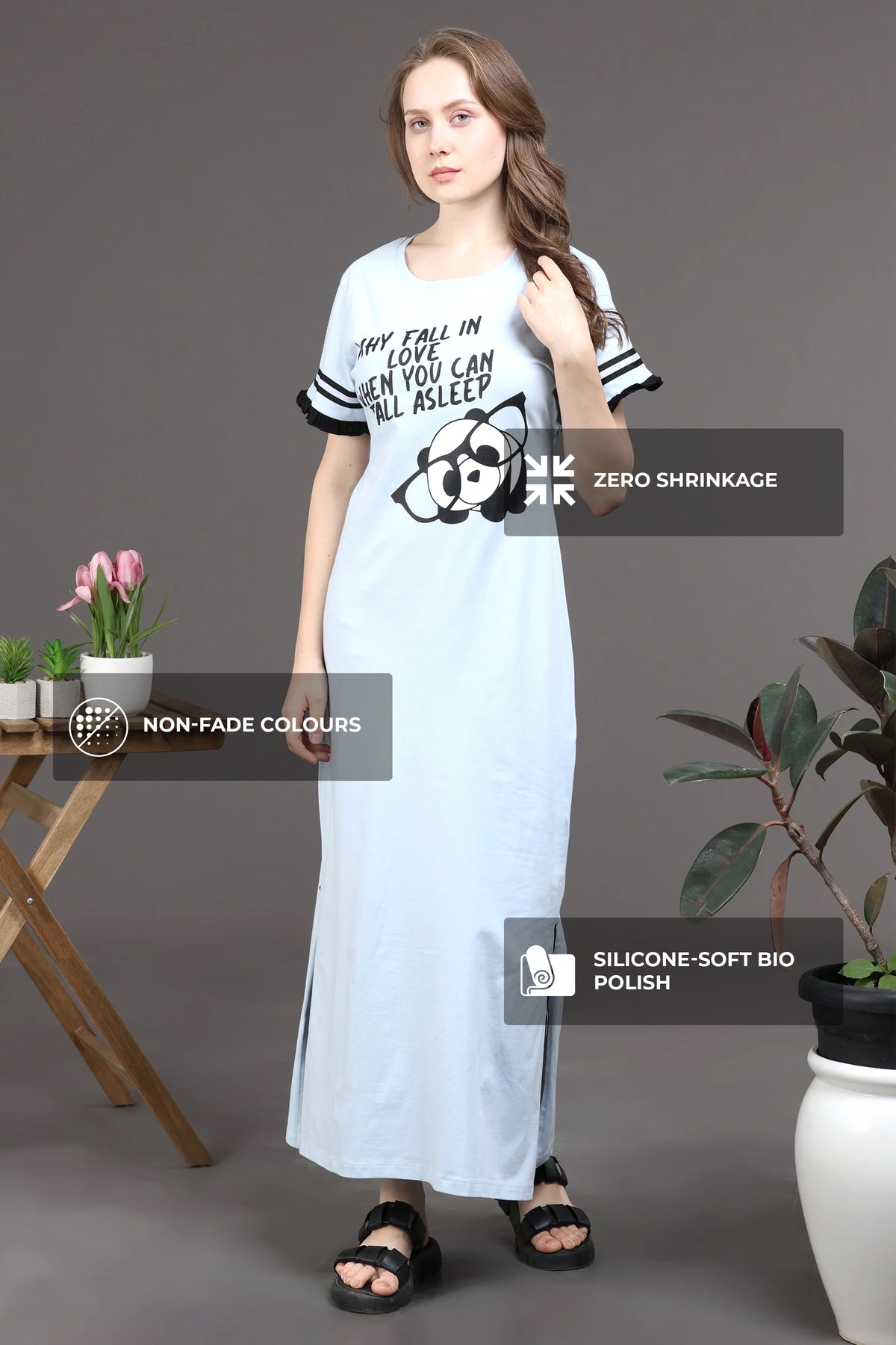 Designed for both comfort and style, the dress features a side slit on the leg, offering a glimpse of flair and ease of movement. Whether you're winding down for the night or simply lounging in style, this night dress ensures a perfect blend of relaxation and fashion-forward sophistication. Slip into this sporty yet comfortable attire, where each detail is meticulously crafted for a stylish and cozy bedtime experience..