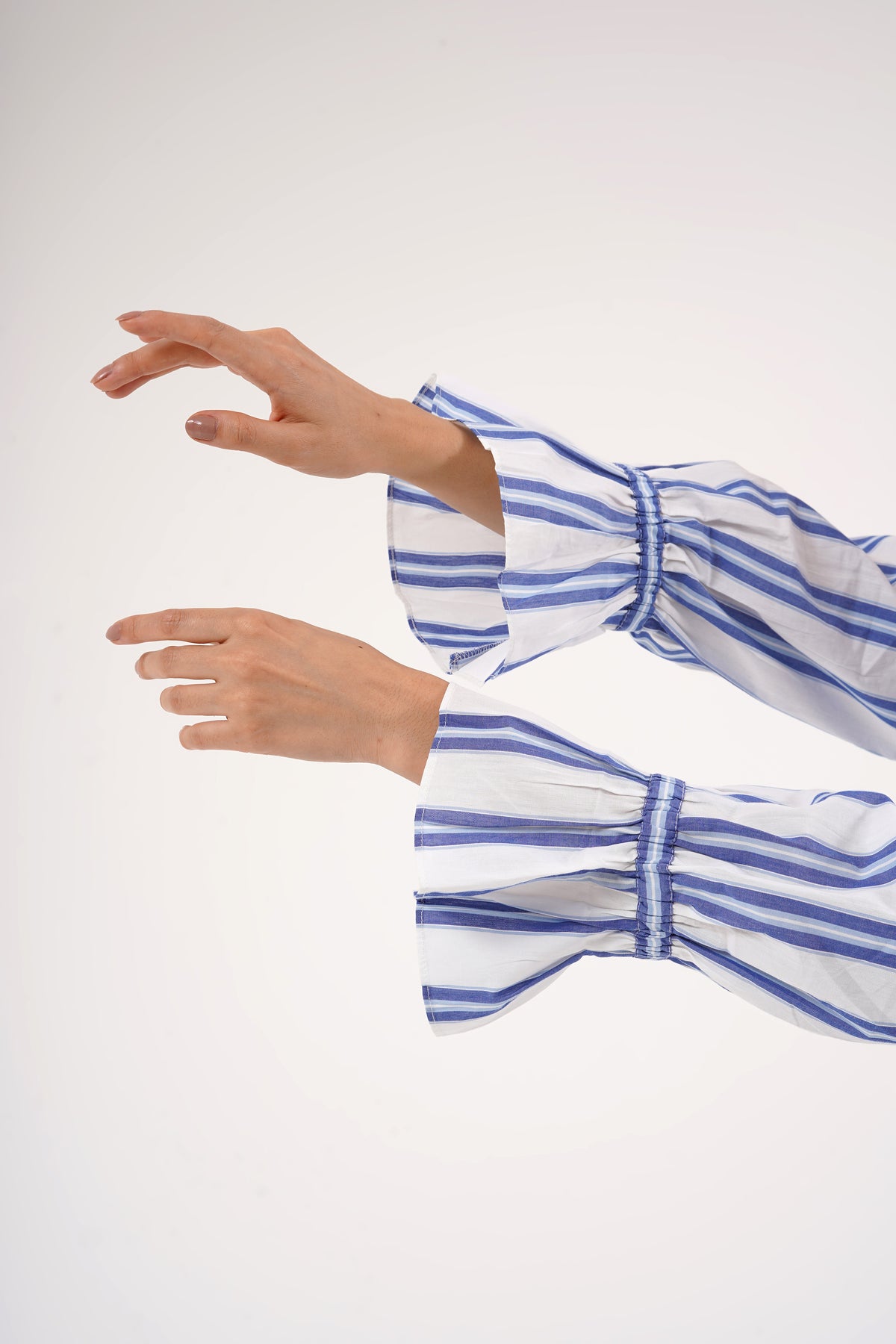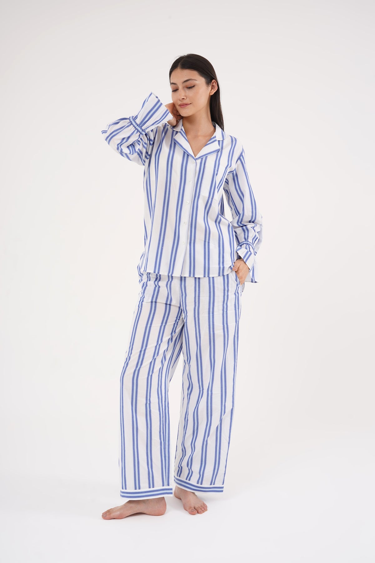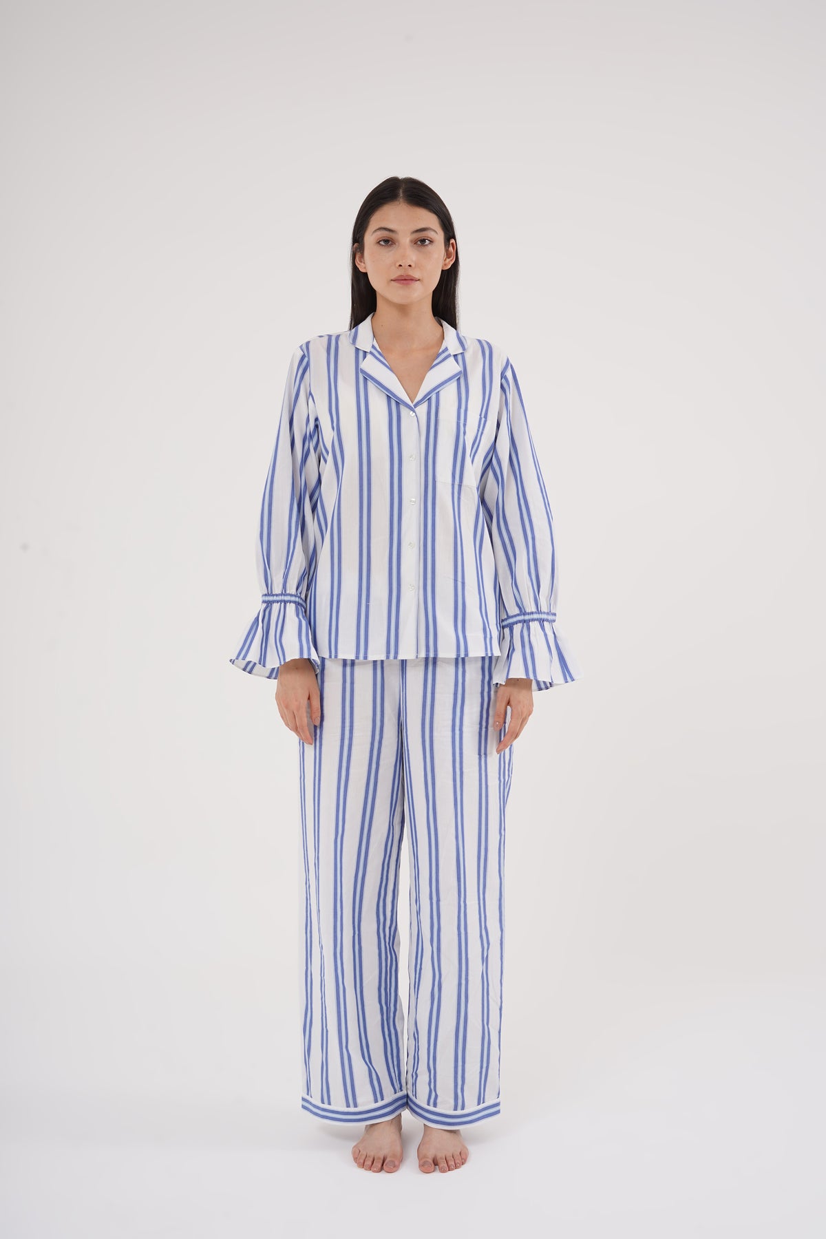 Timeless stripes meet modern comfort in this elegant Blue Breeze Cotton Co-ord Set. Crafted from 100% breathable cotton, it features soothing blue-and-white vertical stripes that elongate the silhouette, with flared cuff sleeves adding a refined touch. The button-down collared shirt pairs effortlessly with relaxed straight pants featuring an elastic waistband for all-day comfort. Lightweight, airy, and chic — this set is perfect for lounging, work-from-home days, or casual evenings in style.