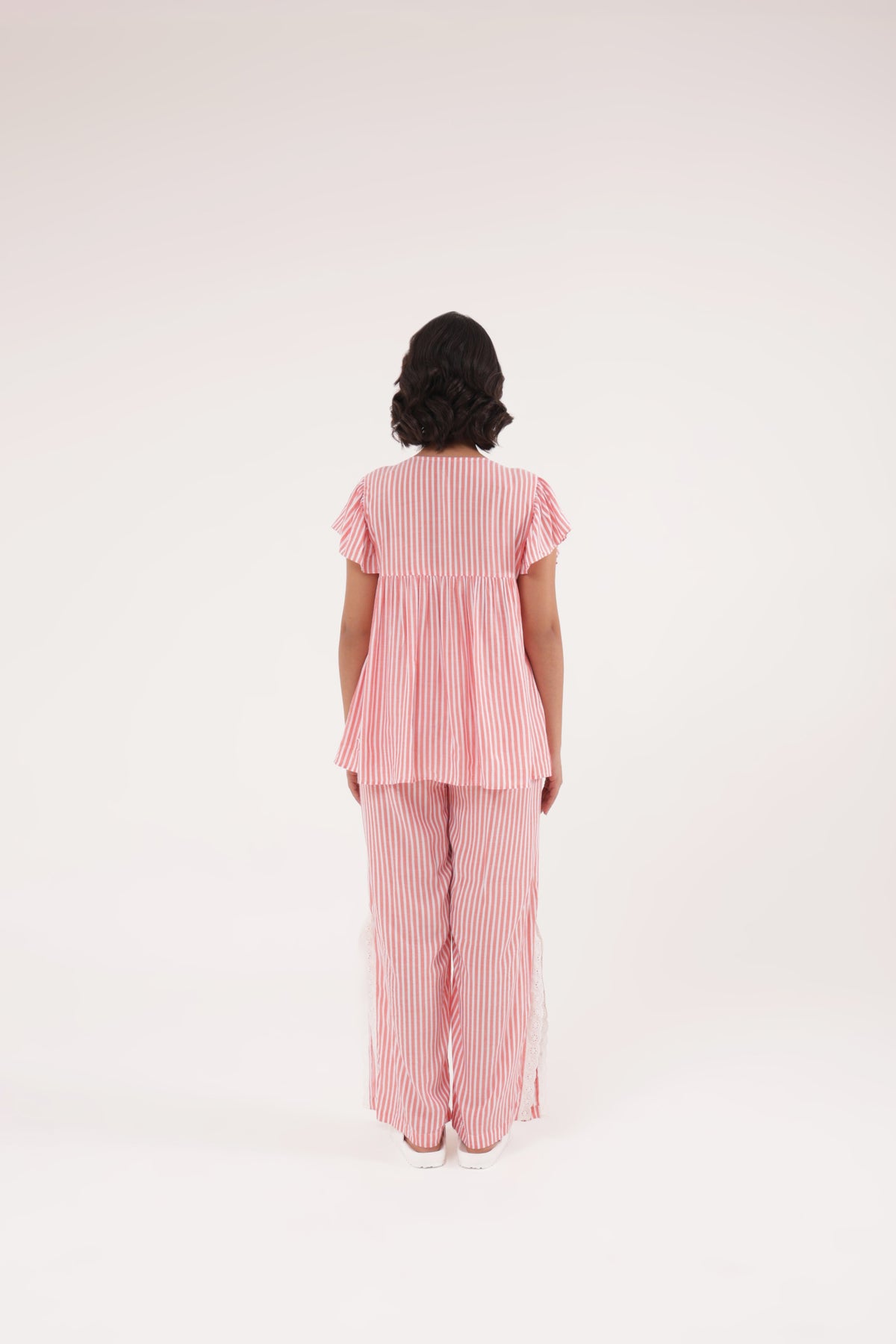 Refresh your everyday style with this elegant striped co-ord set crafted in soft, breathable rayon dobby fabric. The top is designed with a deep V-neckline framed in delicate embroidered lace trim, flutter sleeves, and a relaxed empire-line silhouette that drapes gracefully for a feminine, airy feel.