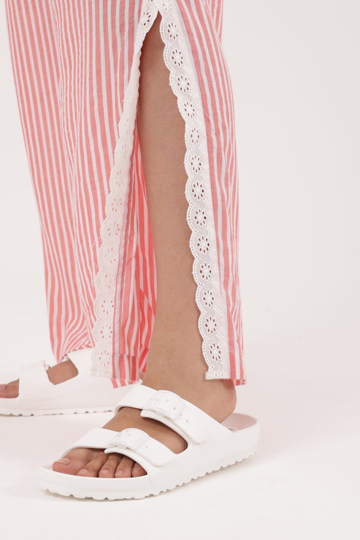 The matching straight-fit pants come with an elasticated waist for comfort and beautiful lace inserts along the side seams, adding a touch of charm and handcrafted detailing. The dobby weave enhances the natural drape of rayon, giving the set a subtle texture and fluid fall. Perfect for both lounging and casual outings, this set blends style with all-day ease.