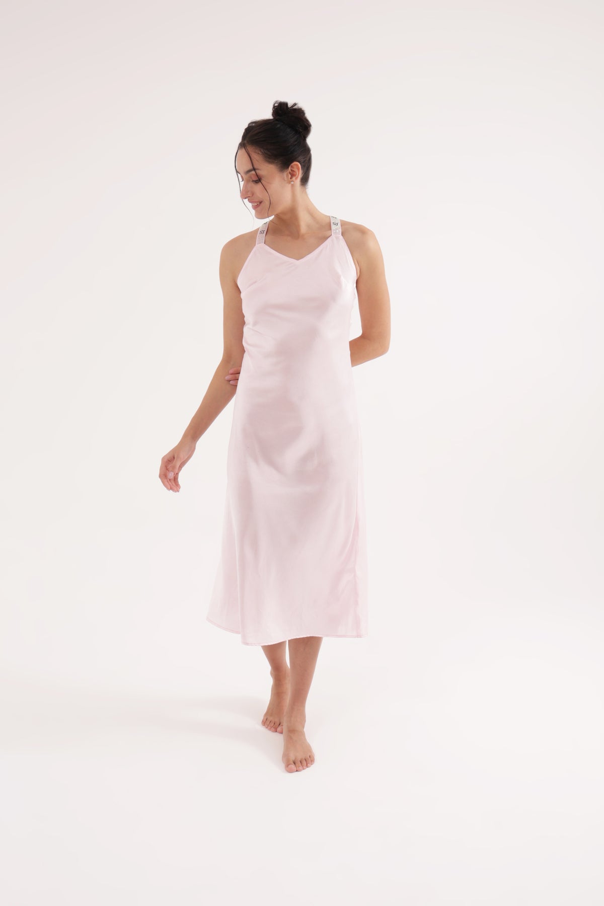 This statement blush-pink calf-length slip from SlumberJill is crafted in glossy Japan satin that glides effortlessly over the silhouette. The front shimmers with scattered rhinestone logo details, adding a delicate sparkle, while the back mesmerizes with a plunging design of slender crisscross satin straps. At its center, a radiant rhinestone-shine strap catches the light with every movement, lending brilliance to the strappy design. Fluid, graceful, and endlessly refined, this piece is made for evenings that celebrate beauty, allure, and unforgettable presence.